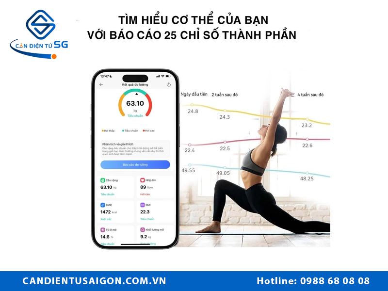 Thay vì chỉ hiển thị một con số duy nhất, cân điện tử thông minh cung cấp một “bản đồ” sức khỏe toàn diện qua ứng dụng điện thoại: