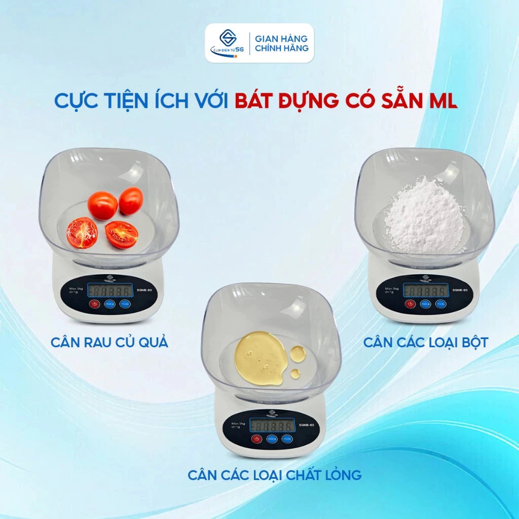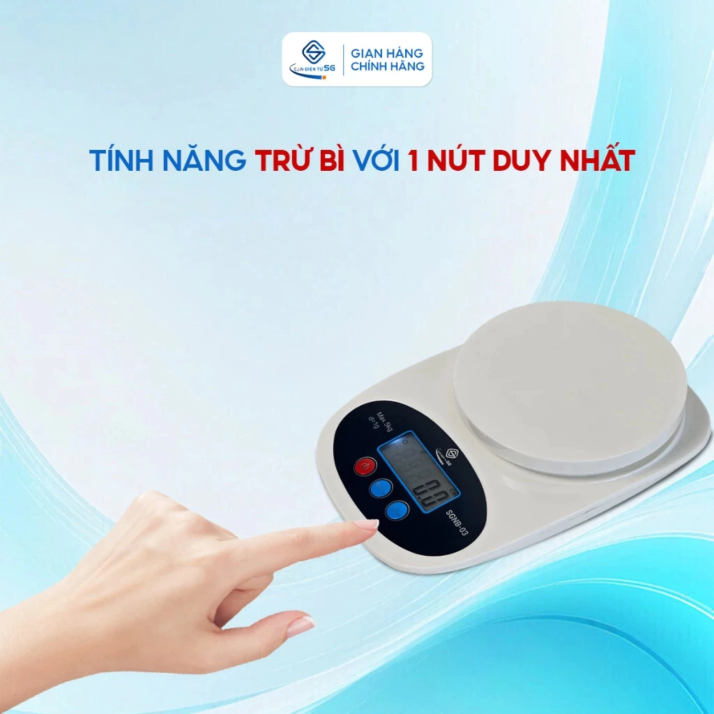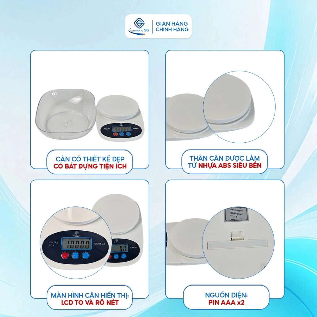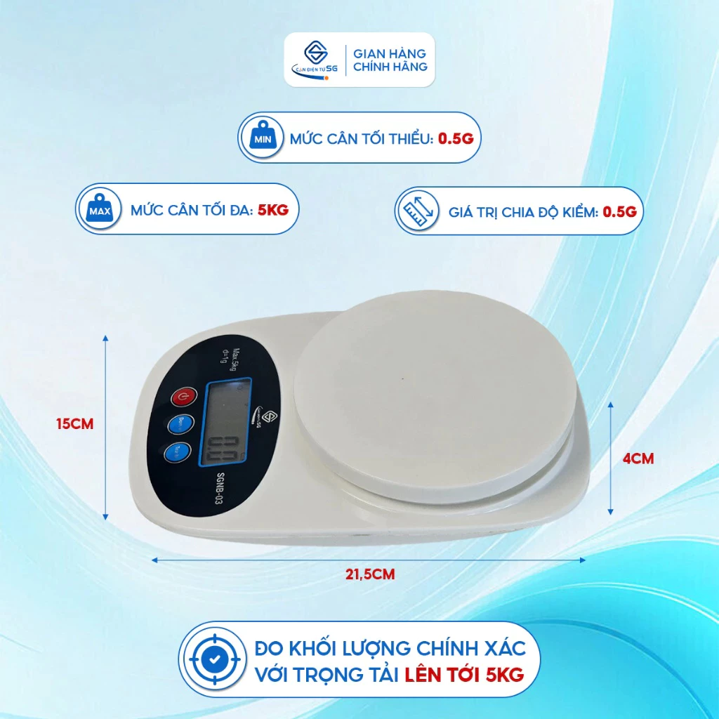 Sản phẩm đáp ứng mức tải trọng lên tới 5kg, thích hợp cho nhu cầu đong đếm nguyên liệu gia đình. Mức định lượng tối thiểu từ 1g và bước nhảy 0.5g đảm bảo sự chi tiết khi đo gia vị, men nở. Trong nhóm cân điện tử nhà bếp hiện nay, mức tải này phục vụ tốt hầu hết công thức nấu ăn. Tương tự như dòng cân điện tử nhà bếp SGNB-04 hay các hệ máy cân điện tử mini nhà bếp 5kg 10kg, thiết bị mang lại sự tiện dụng cho người nội trợ khi chuẩn bị thực phẩm khối lượng lớn.