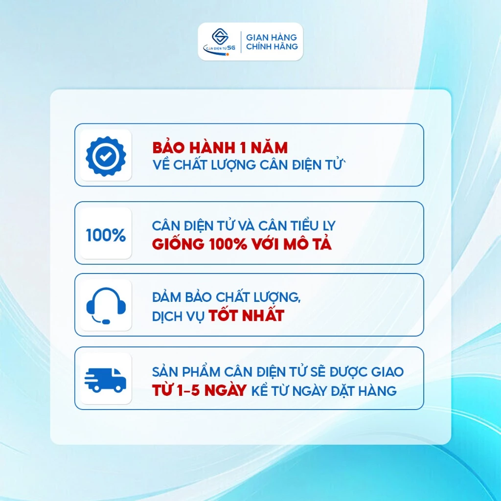 Mỗi thiết bị khi đến tay khách hàng đều được Cân Điện Tử Sài Gòn đảm bảo độ mới 100% so với thông tin mô tả. Chế độ bảo hành kéo dài 1 năm về chất lượng bo mạch điện tử giúp người dùng an tâm thao tác mỗi ngày. Về khâu vận chuyển, các đơn hàng sẽ được đóng gói cẩn thận và giao tận nơi trong khoảng từ 1 đến 5 ngày tùy theo khoảng cách địa lý, đảm bảo tiến độ sử dụng của người mua.